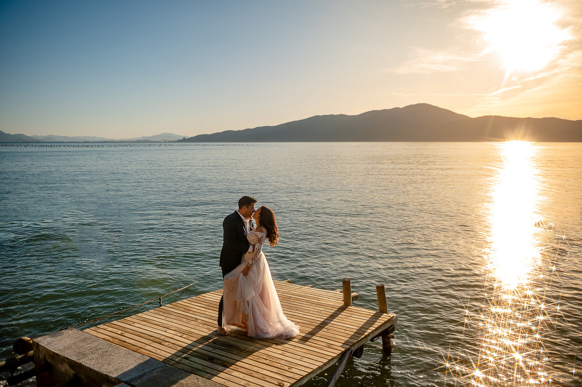O ensaio de renovação de votos de Bruna e Bruce foi uma experiência tão mágica quanto o casamento que tivemos a honra de fotografar dois anos atrás. Desta vez, o cenário escolhido foi um deck encantador de uma pousada próxima à Praia da Tainha, em Bombinhas, onde o casal celebrou sua jornada de amor com um belíssimo pôr do sol.