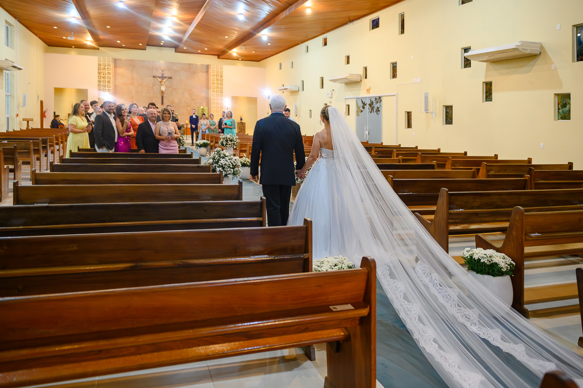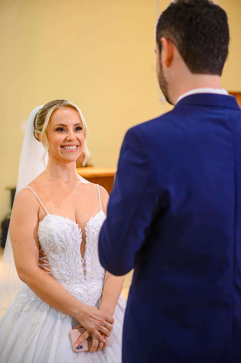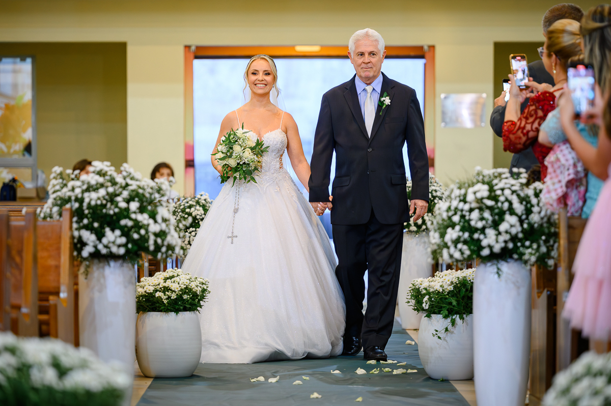 A magia da cerimônia na Paróquia Nossa Senhora Aparecida A cerimônia religiosa foi realizada na charmosa Paróquia Nossa Senhora Aparecida, em Balneário Camboriú. Os noivos emocionaram a todos com a leitura de votos personalizados, enquanto elementos simbólicos como o balão branco representando o filho do casal trouxeram um toque ainda mais especial ao momento. Para finalizar, um cortejo com sparkles iluminou o caminho dos recém-casados, criando um cenário mágico e inesquecível.