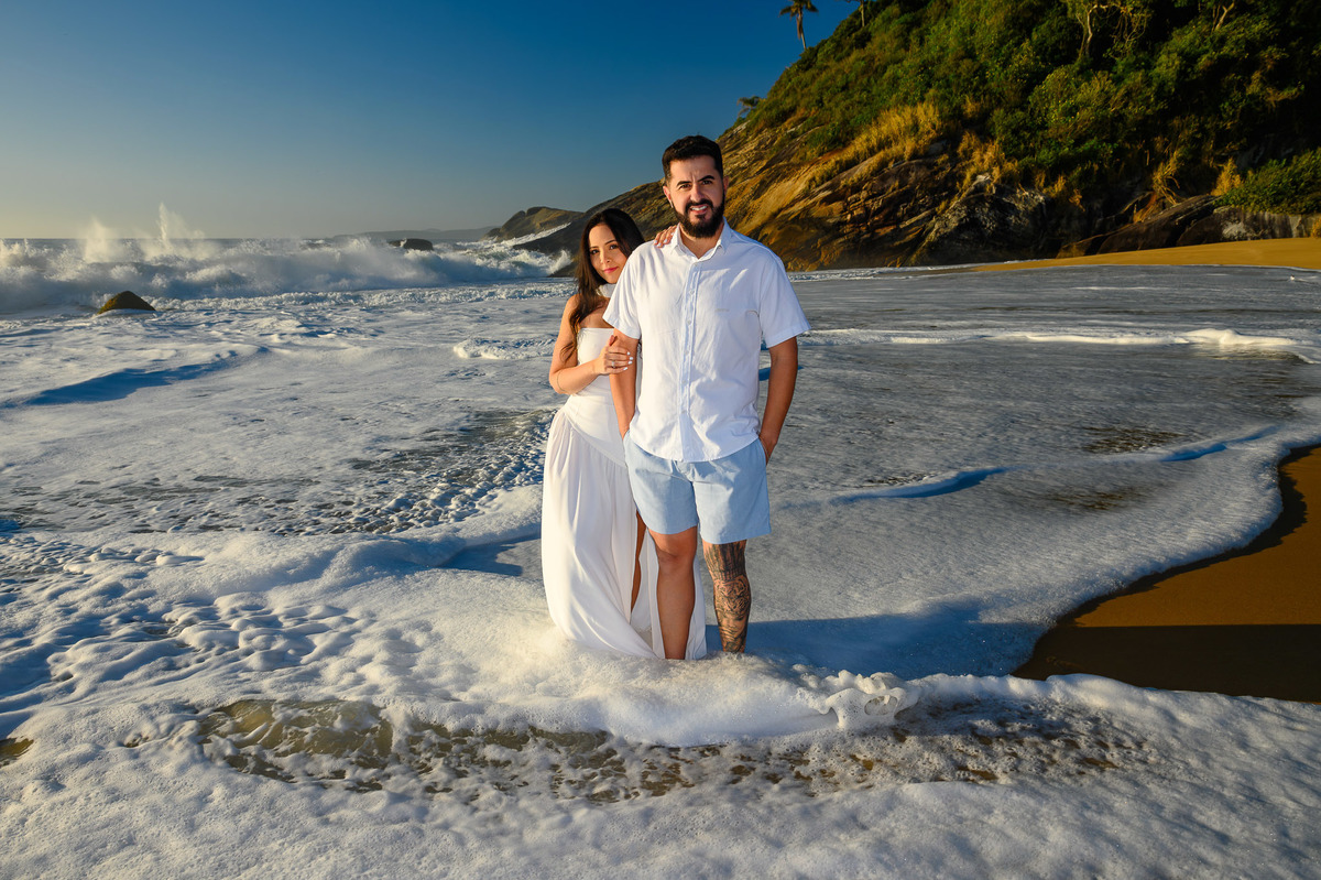O ensaio da Milena e do André aconteceu exatamente nesse cenário. Logo nas primeiras horas da manhã, com a praia praticamente só para eles, foi possível criar imagens com mais liberdade, sem interferências visuais e com uma sensação de exclusividade que faz toda a diferença no resultado final. O silêncio, o som do mar e a luz dourada surgindo no horizonte ajudam o casal a relaxar — e isso aparece claramente nas fotos.
