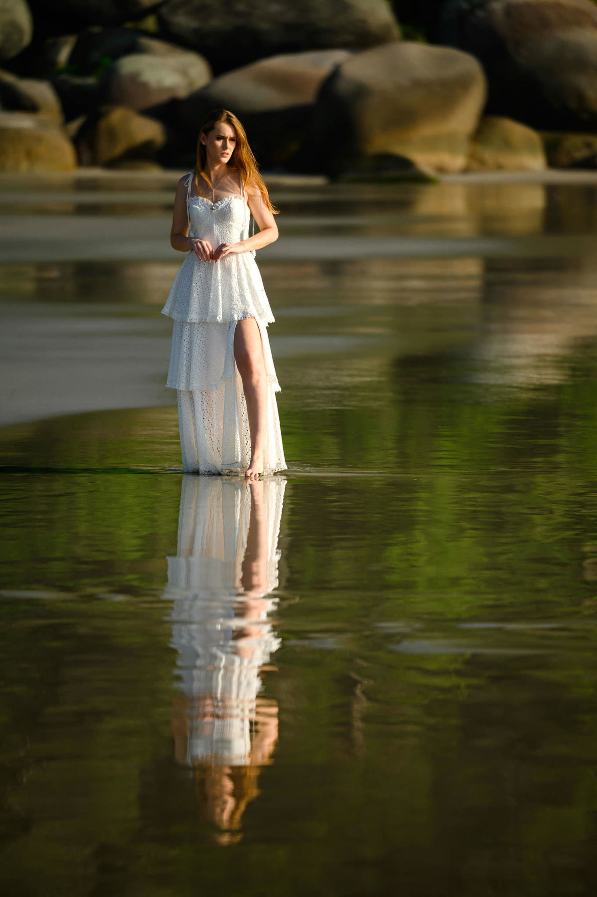 praia aberta, pedras, deck de madeira e, no final, as fotos dentro do mar, que sempre rendem imagens mais intensas e marcantes para o pré-wedding.