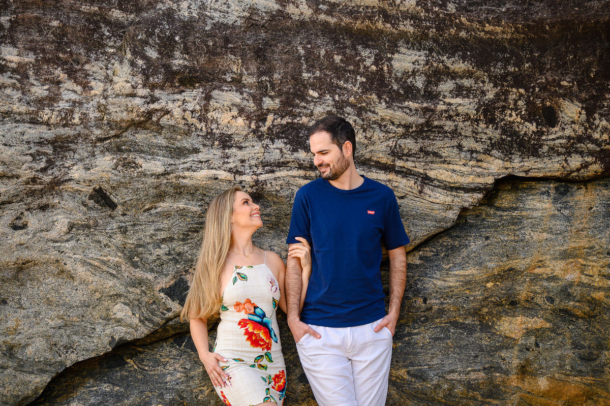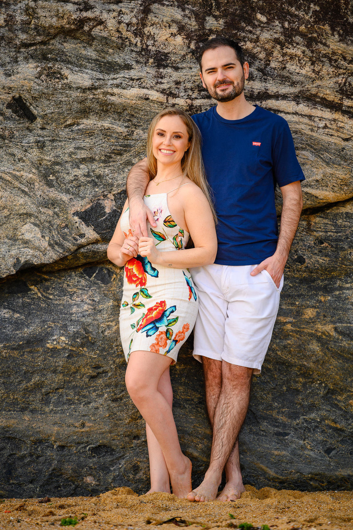 Nesse ensaio, começamos explorando a faixa de areia ainda com a luz baixa do amanhecer, depois seguimos para as pedras, buscando variações de enquadramento, planos mais abertos com o cenário do Estaleirinho ao fundo e também retratos mais fechados, cheios de conexão. Essa combinação de paisagens com momentos mais íntimos ajuda a criar uma narrativa visual mais completa do ensaio.