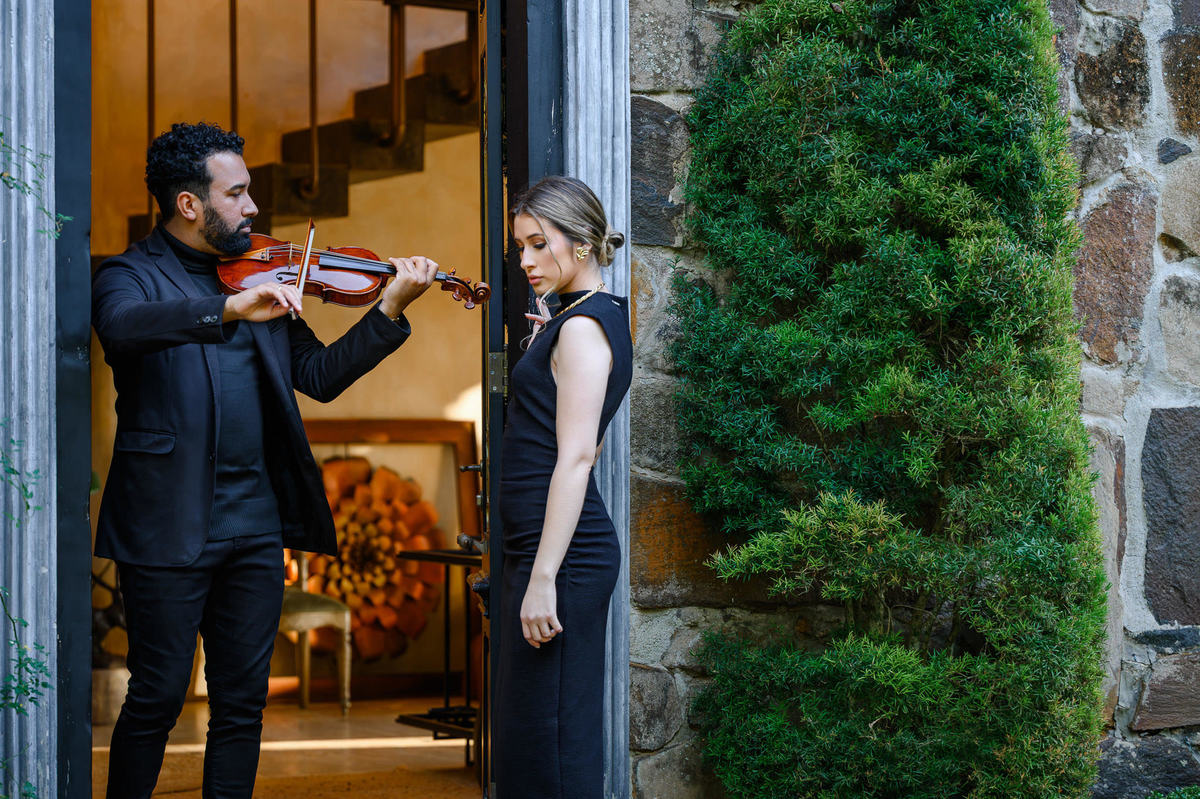 Um detalhe que trouxe ainda mais identidade ao ensaio foi a presença da música. O Stefley é músico e toca violino, e utilizamos isso em algumas cenas para criar imagens que conversam diretamente com a história do casal. Esses elementos pessoais fazem toda a diferença para que o ensaio não seja apenas bonito, mas também verdadeiro e com significado.