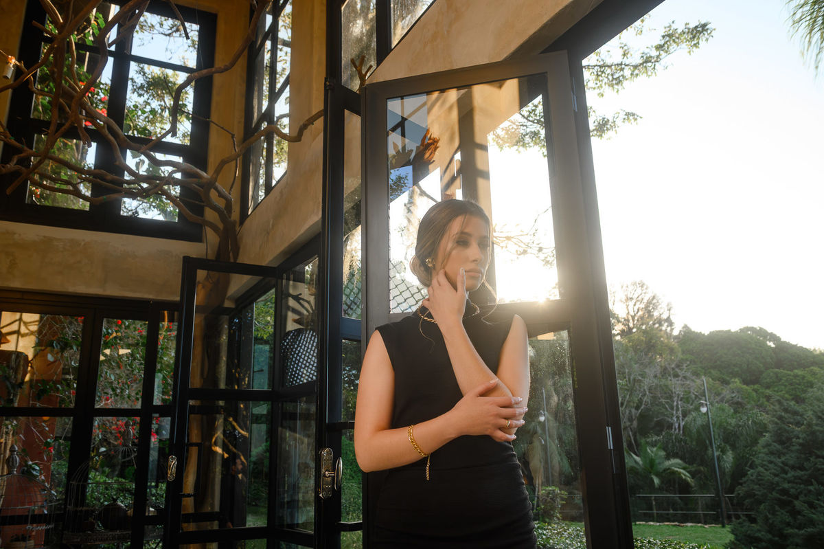 A Casa Maciço oferece diferentes ambientes dentro do mesmo local: áreas internas com luz suave e recortes arquitetônicos, jardins, portas e janelas que emolduram a paisagem, além de espaços externos que permitem explorar a vista para Florianópolis ao fundo. Isso possibilitou uma variação grande de cenários sem precisar de deslocamento, mantendo o ritmo do ensaio fluido e confortável.