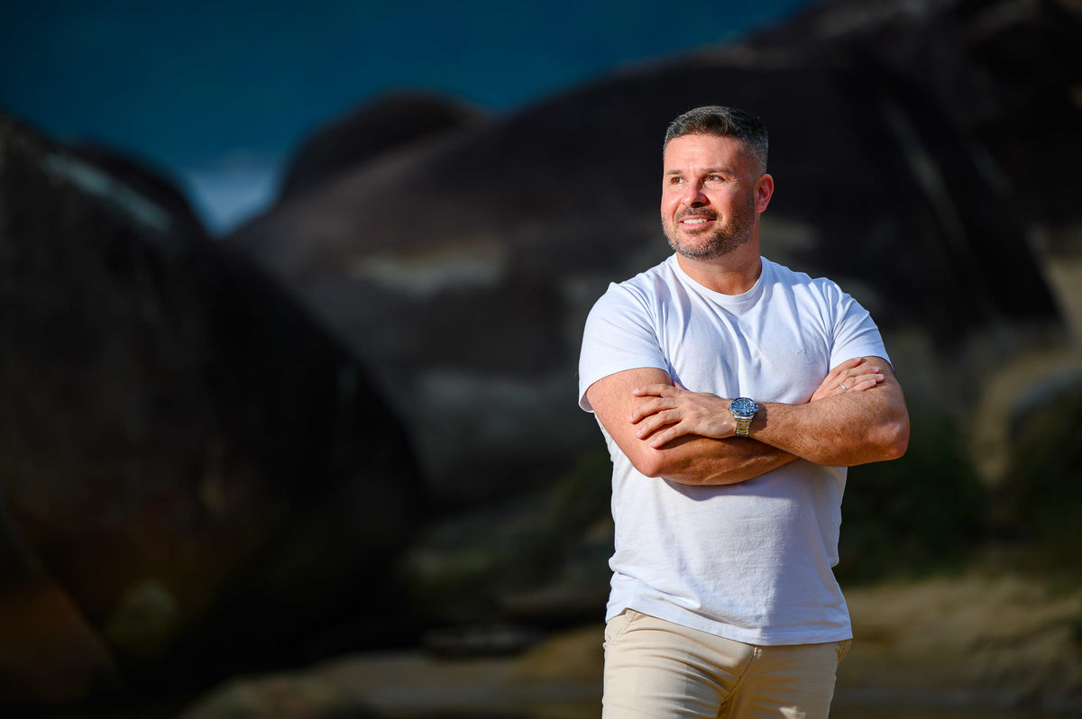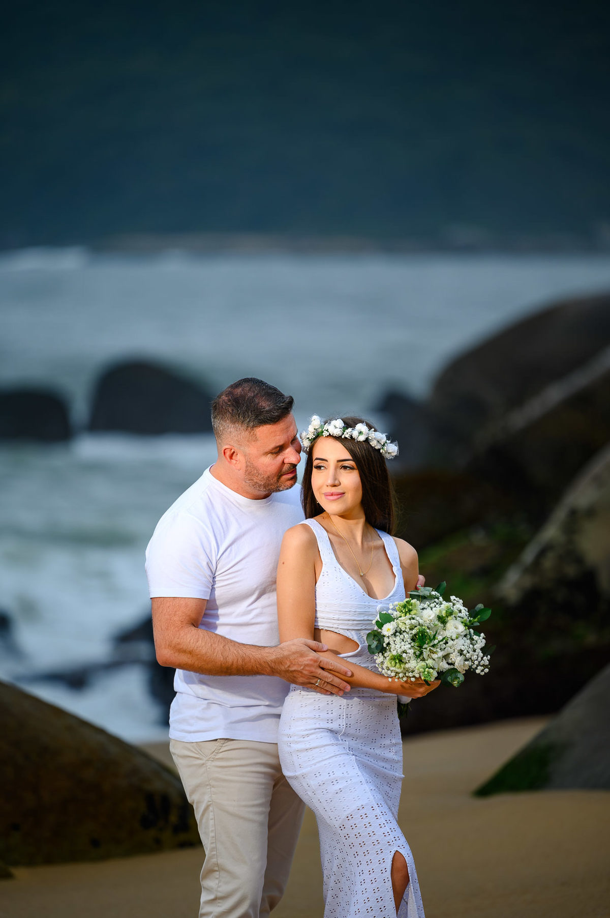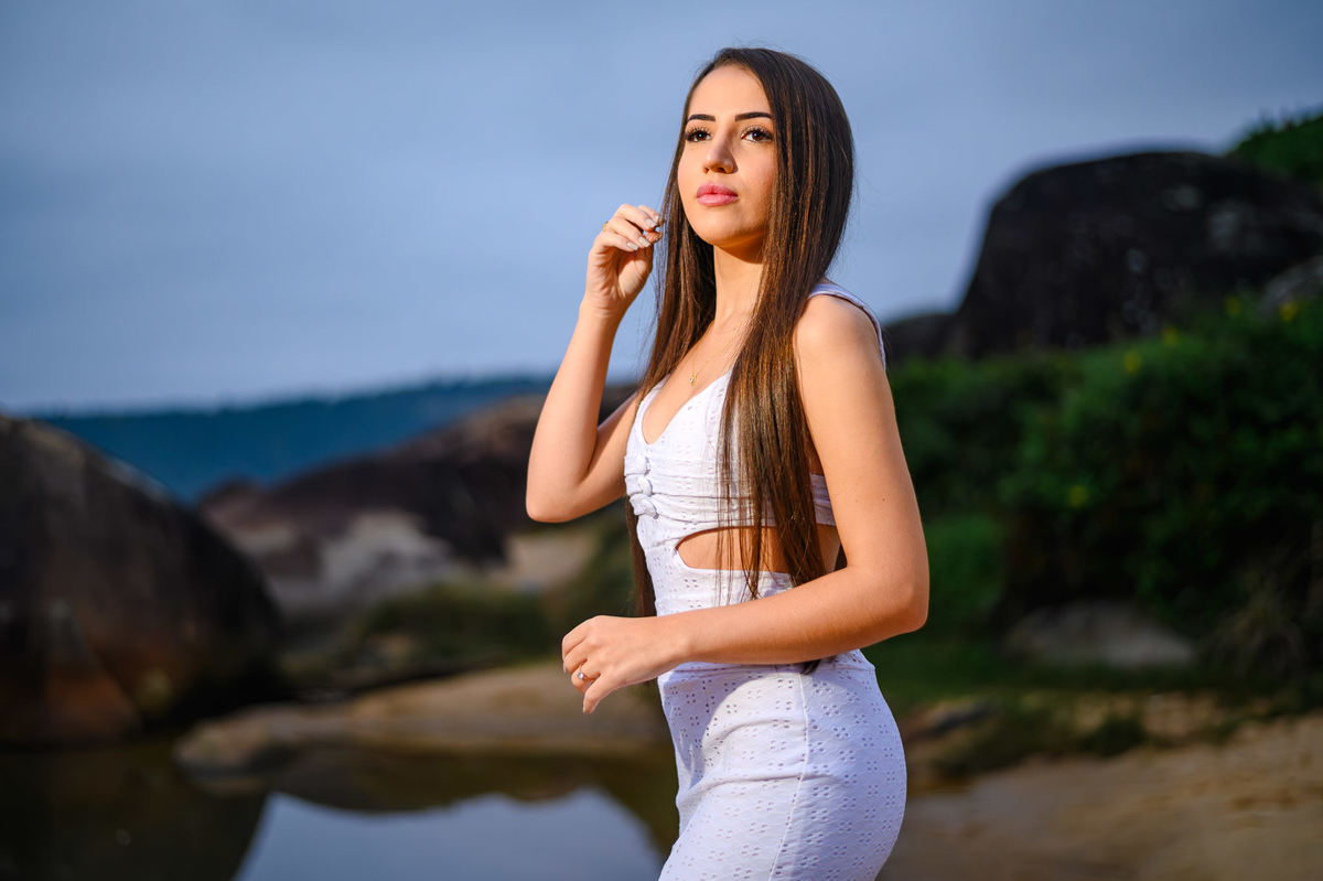 Fotografamos parte do ensaio ainda com pouca luz, depois seguimos com as fotos já com o dia clareando e finalizamos na praia, explorando as pedras e a paisagem de Taquarinhas, que é um dos lugares mais bonitos de Balneário Camboriú para quem busca um visual mais natural e menos urbano.