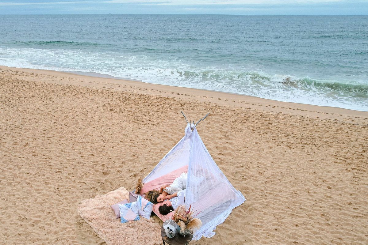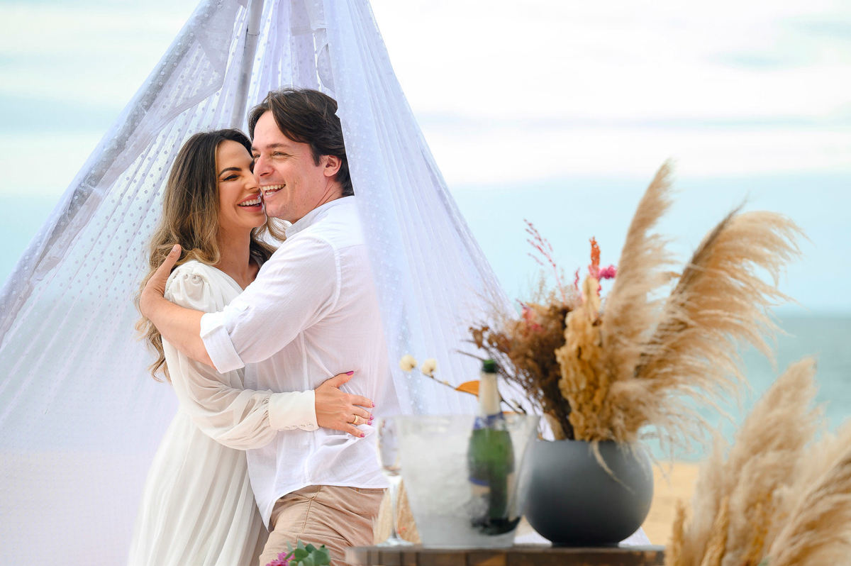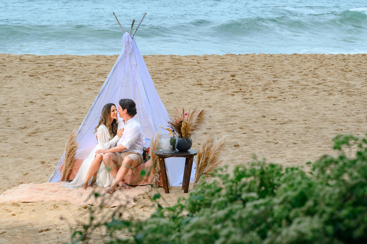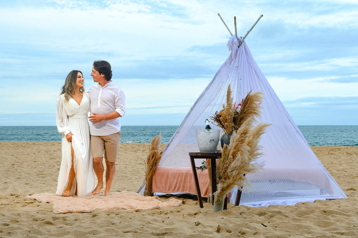 A Francieli e o Fábio vieram do interior do Paraná, então essa era a única data possível para realizar o ensaio. Mesmo assim, o resultado ficou leve, romântico e com a cara deles. As fotos misturam momentos de conexão do casal com cenas mais espontâneas à beira-mar, além de registros com a decoração montada pelo Bali Bistrô, que deixou o cenário ainda mais especial para o pré-wedding.