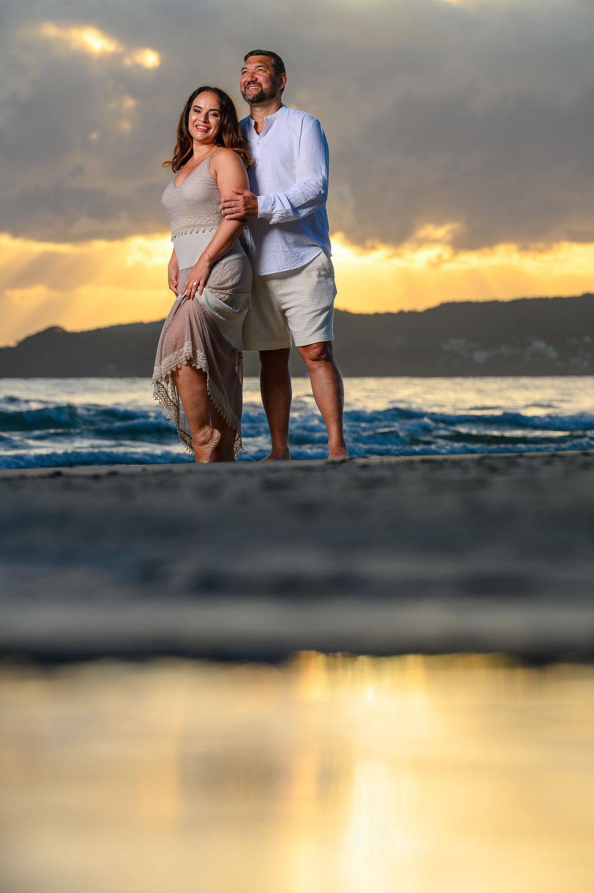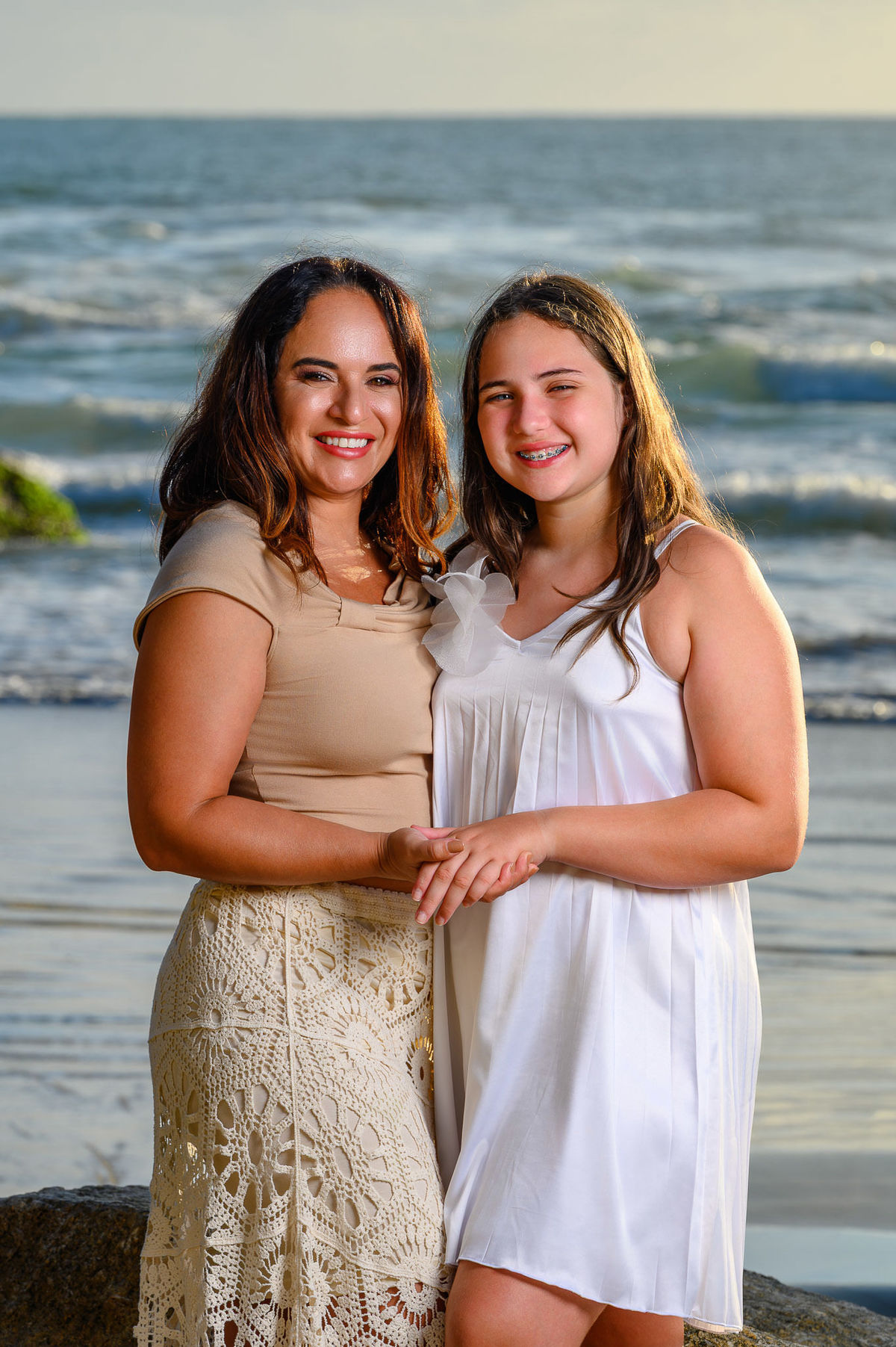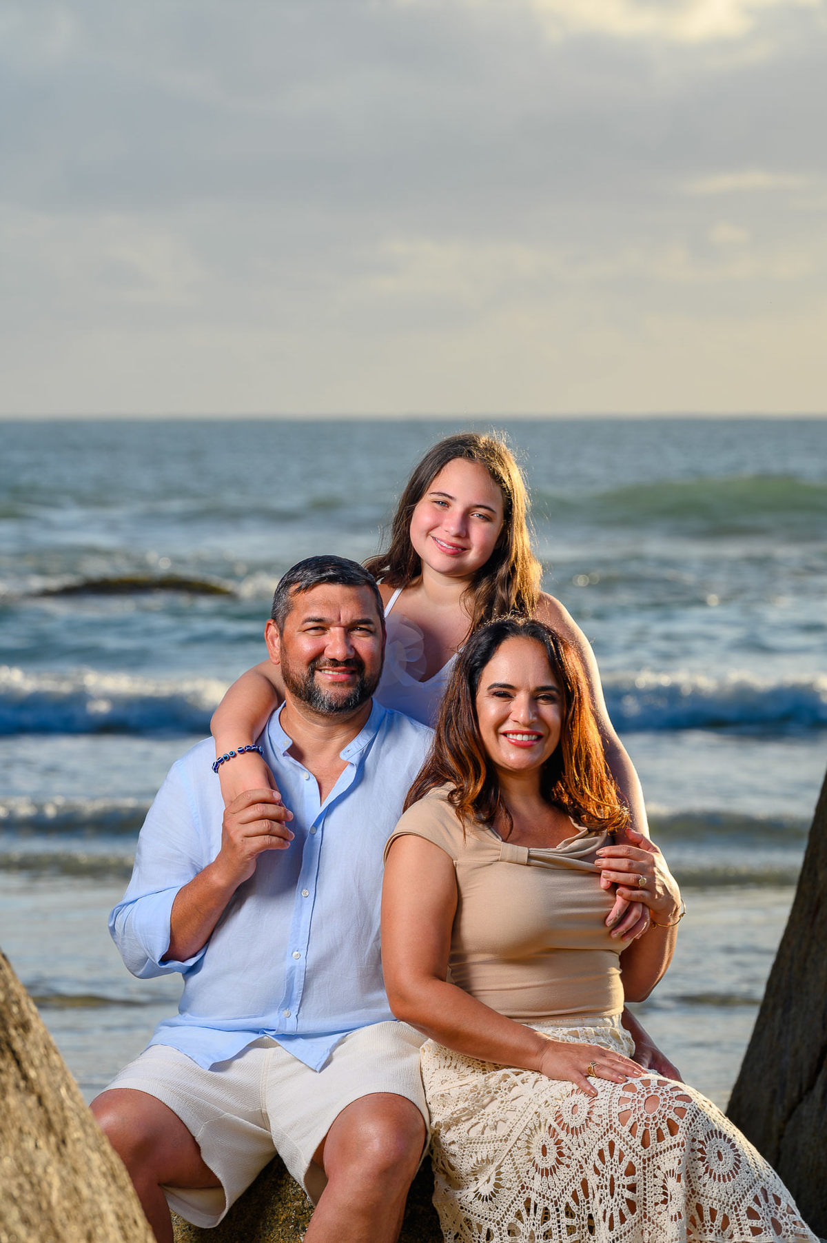 Escolhemos a praia como cenário justamente por trazer essa atmosfera leve e natural. O ensaio aconteceu em um horário de luz mais suave, o que ajudou a criar um clima acolhedor, com cores mais quentes e uma sensação de fim de tarde que combina muito com fotografias em família. A proposta foi conduzir o mínimo possível, deixando que as interações acontecessem de forma espontânea.