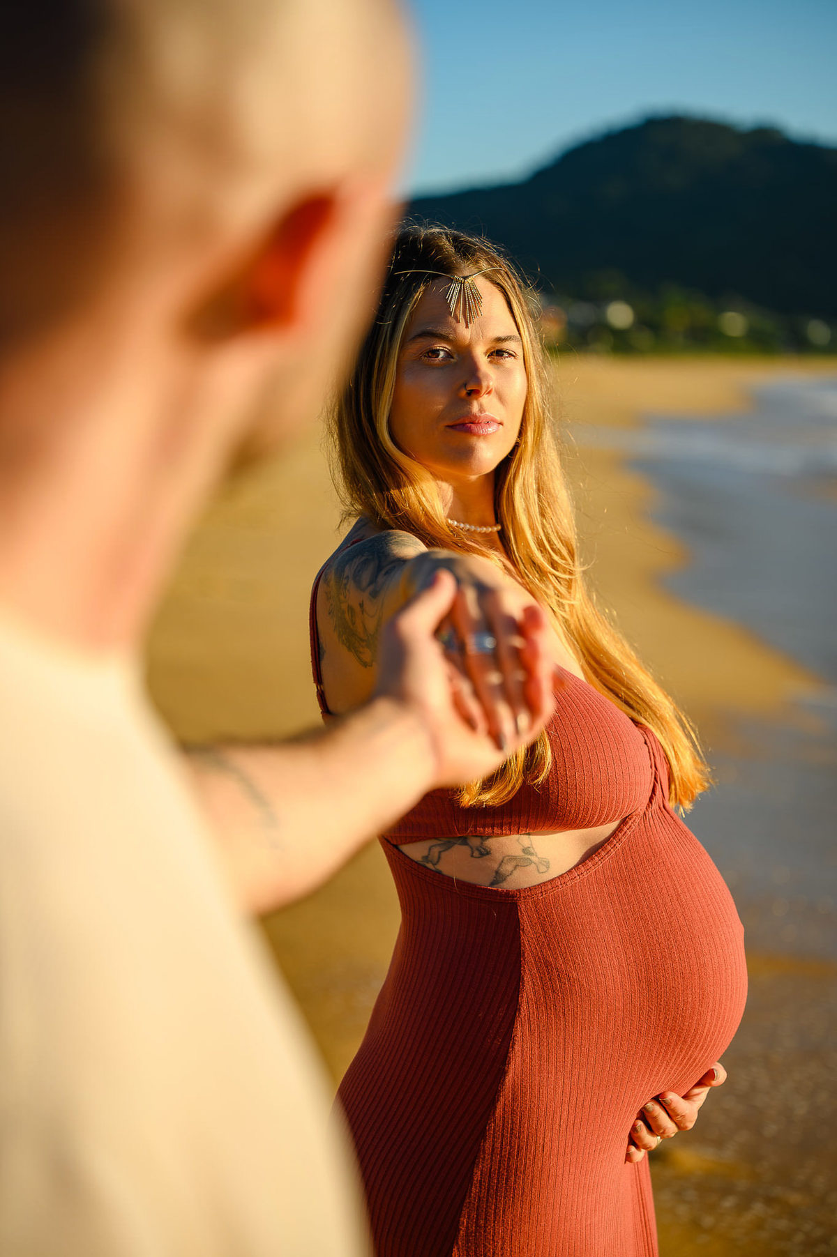 Quando finalmente conseguimos alinhar as agendas, foi especial demais poder fotografar esse momento deles, ainda mais sabendo que a gravidez é um período tão intenso, cheio de mudanças e sentimentos misturados. Escolhemos a Praia do Estaleirinho, em Balneário Camboriú, para o ensaio ao amanhecer — como sempre fazemos — porque a luz é mais suave, a praia está vazia e o clima fica muito mais tranquilo.