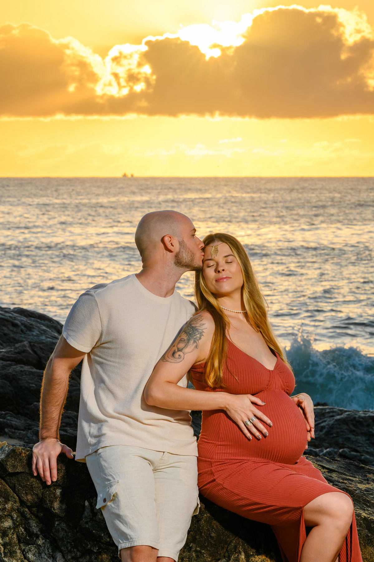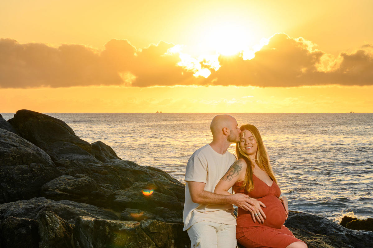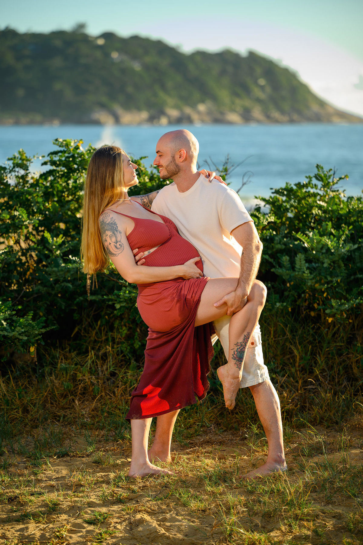 Quando finalmente conseguimos alinhar as agendas, foi especial demais poder fotografar esse momento deles, ainda mais sabendo que a gravidez é um período tão intenso, cheio de mudanças e sentimentos misturados. Escolhemos a Praia do Estaleirinho, em Balneário Camboriú, para o ensaio ao amanhecer — como sempre fazemos — porque a luz é mais suave, a praia está vazia e o clima fica muito mais tranquilo.