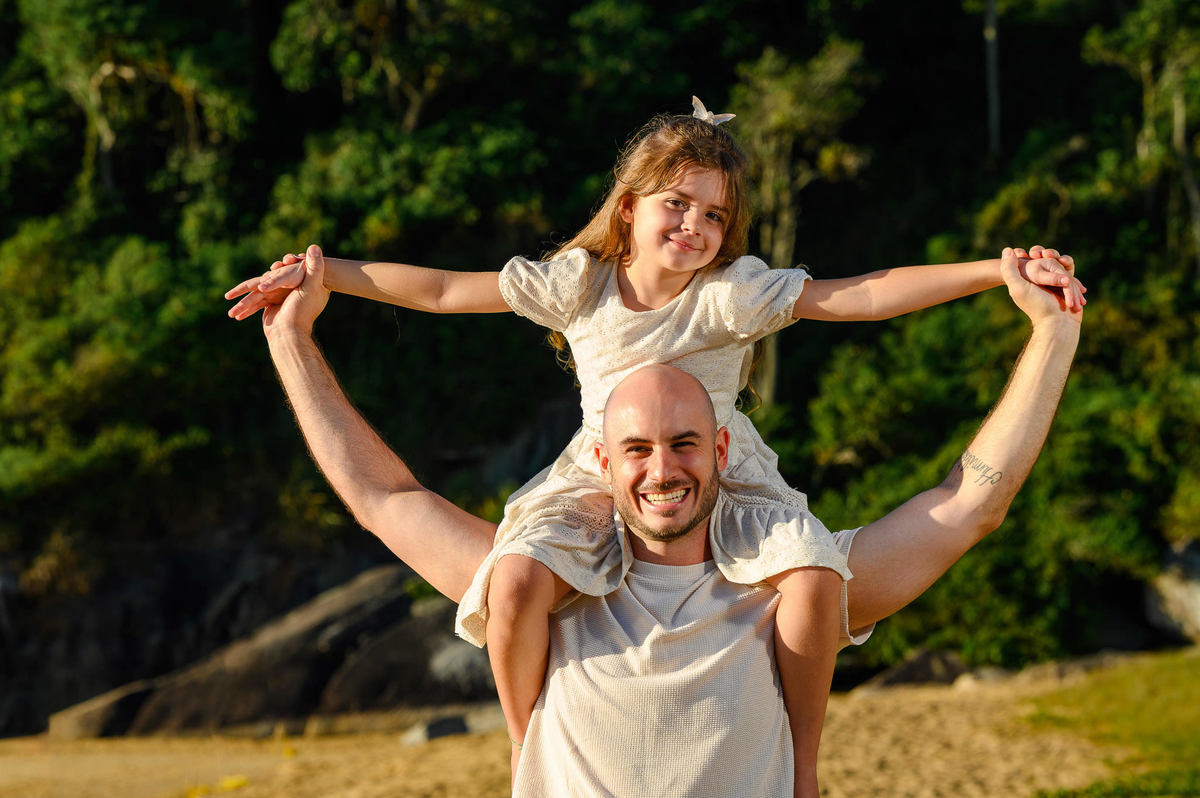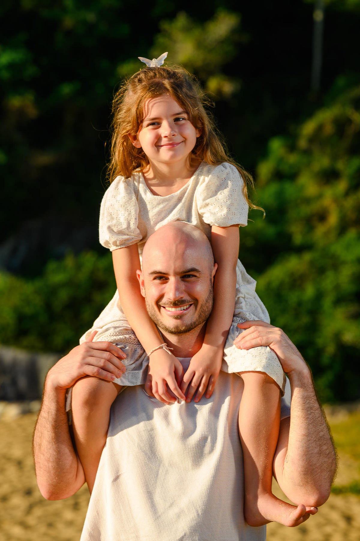 Entre uma pose e outra, surgiram os momentos mais bonitos: olhares, risadas, abraços, a filha participando, a água batendo no pé sem pedir licença… Esse tipo de detalhe que não dá pra planejar, só viver.