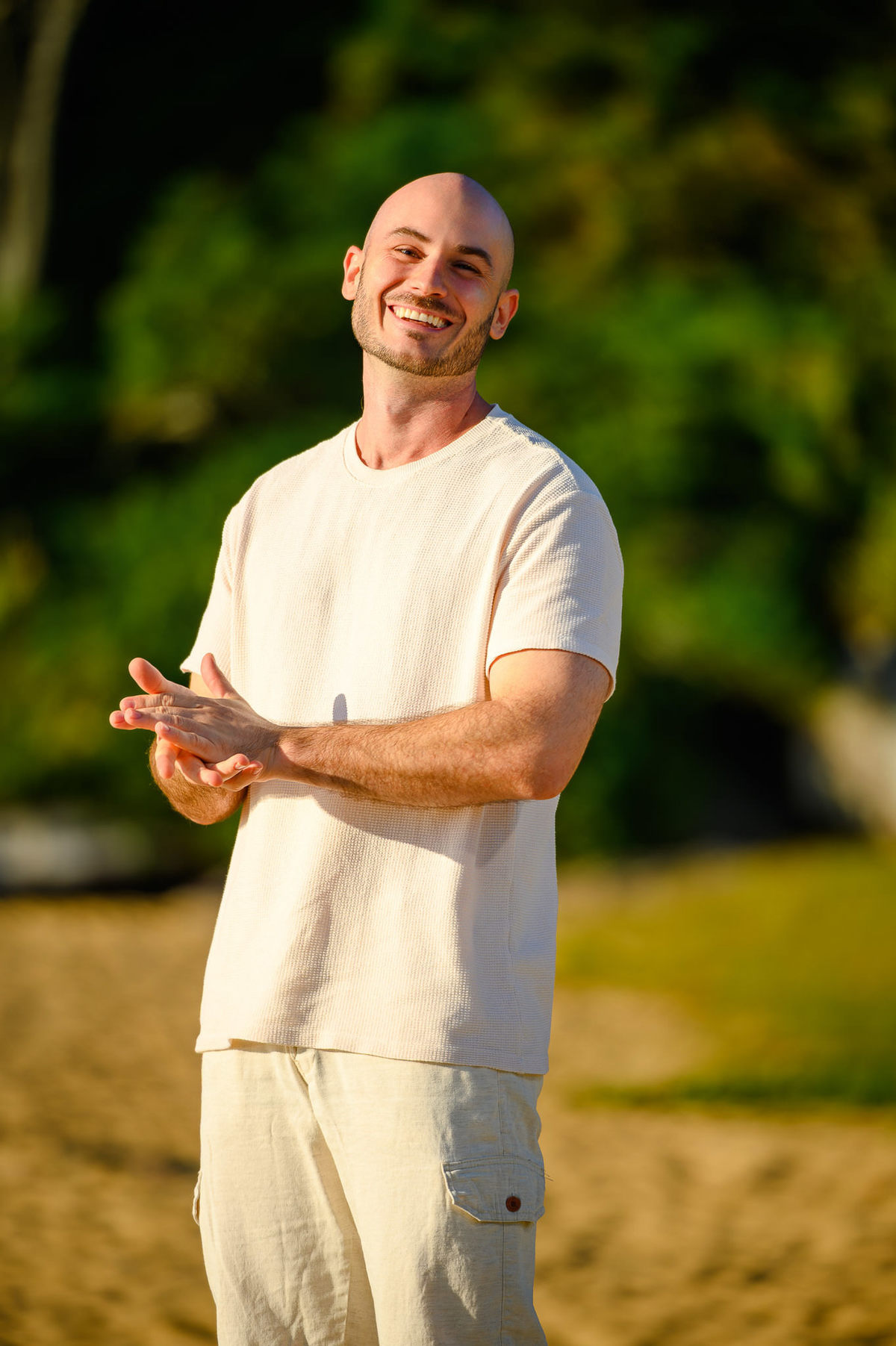A Jaqueline é professora de yoga e tem uma escola com o Andi, a Zayoga. Então foi natural trazer isso para o ensaio: algumas poses de yoga no meio da praia, com o som do mar ao fundo e aquele nascer do sol que deixa tudo com um ar mais calmo e verdadeiro. Não foi nada engessado ou “pose decorada”, foi do jeito deles, no ritmo deles.