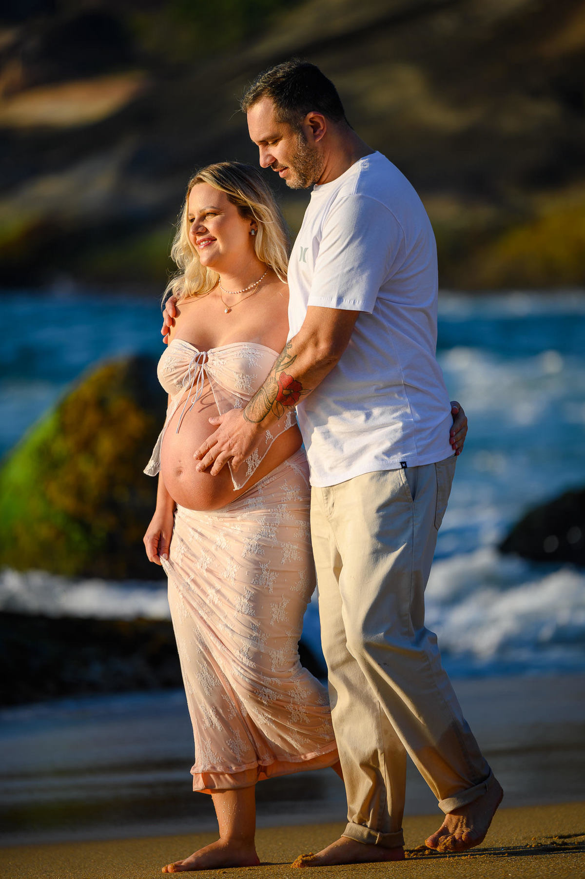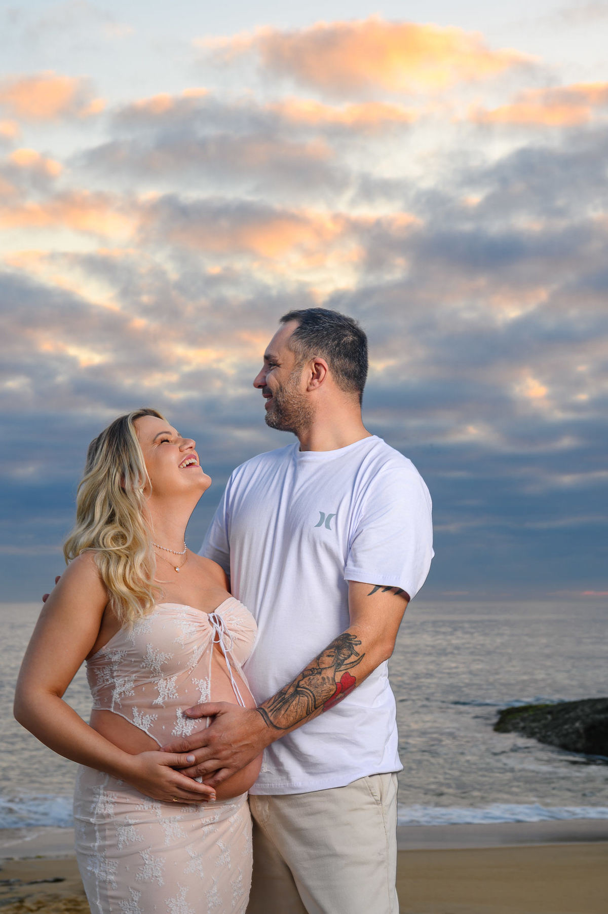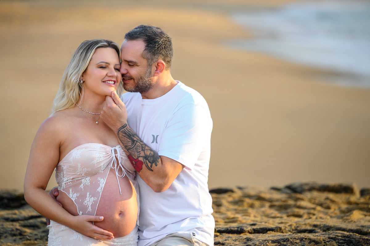 Esse ensaio na Praia do Estaleirinho, em Balneário Camboriú, foi exatamente assim. Caminhamos pela areia ainda fria da manhã, com aquela luz suave que não machuca os olhos e deixa a pele com um tom lindo, natural. Sem pressa, sem multidão ao redor, só o casal curtindo o momento e vivendo essa fase tão intensa da gestação.