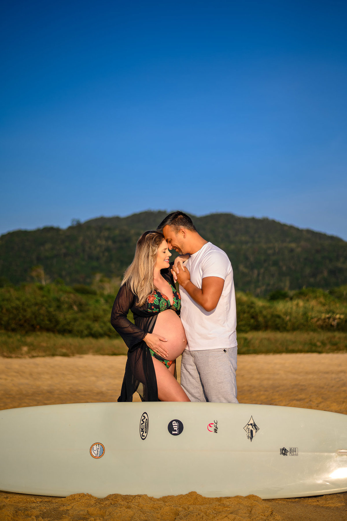 Esse ensaio tem um lugar muito especial no nosso coração. Fotografar esse casal na Praia do Estaleirinho, ao amanhecer, foi mais do que registrar uma gestação: foi viver um começo de dia cheio de calma, conexão e expectativa por uma nova vida que estava chegando.