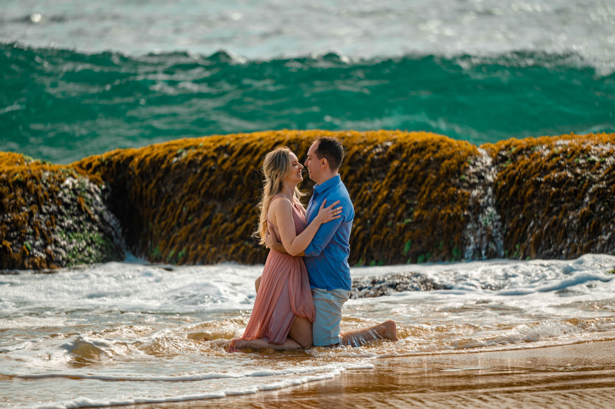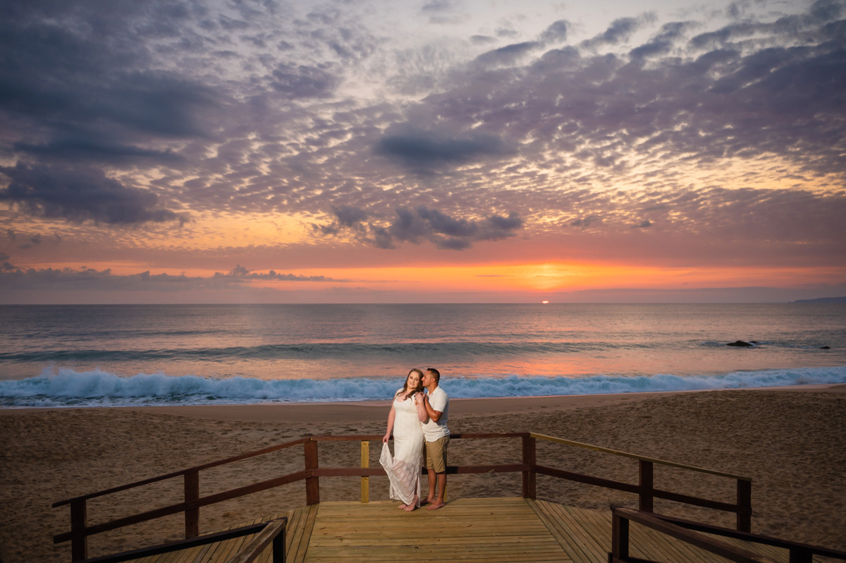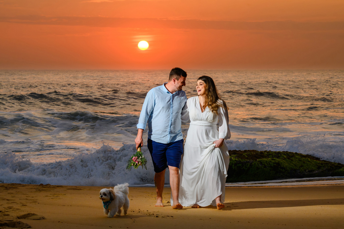 Para um ensaio realmente mágico, comece as fotos logo cedo, ao amanhecer. O sol nascendo no mar cria uma iluminação incrível e um clima cinematográfico.